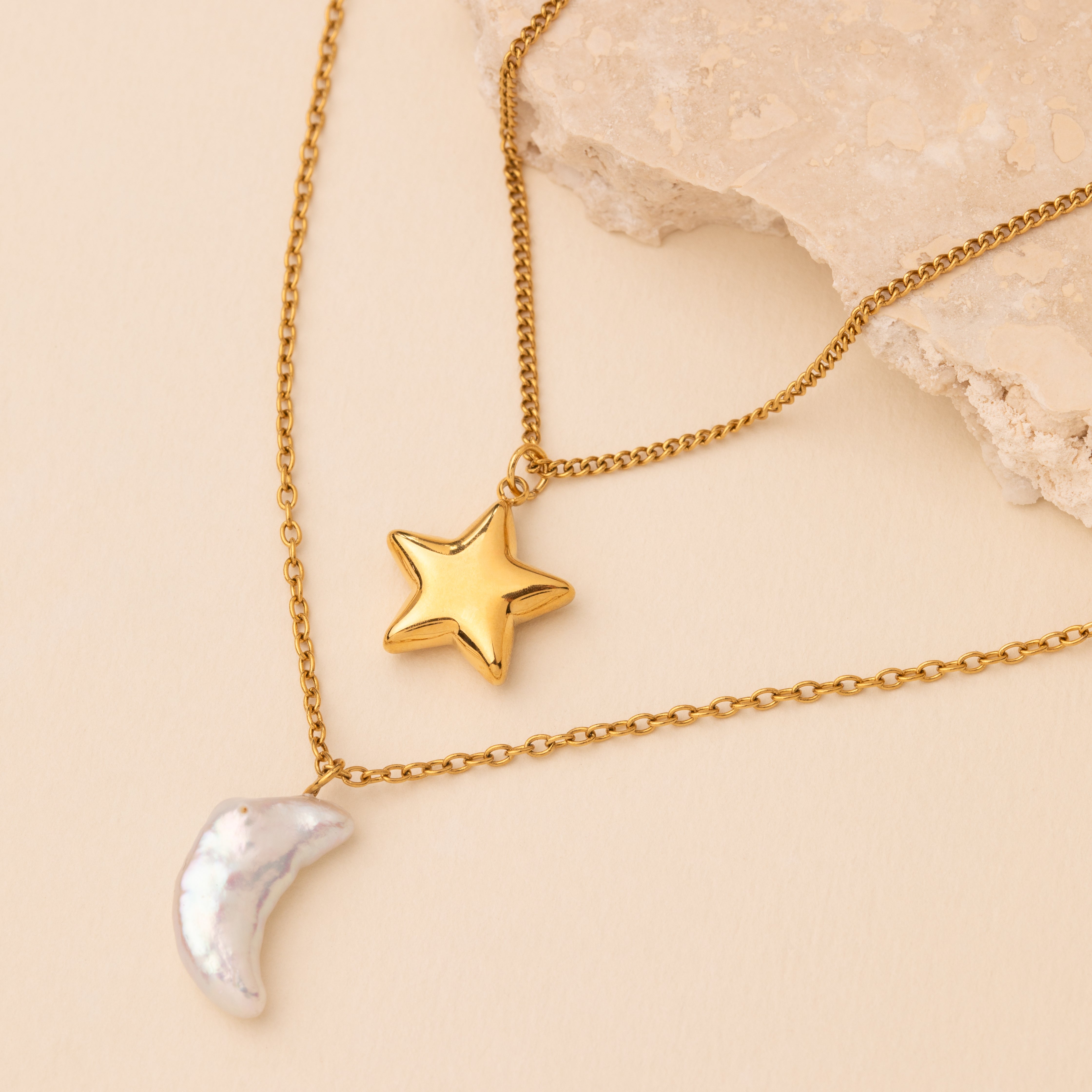 The Luna Eclipse Necklace captures the magic of the night sky in one radiant piece. Featuring a luminous freshwater pearl moon paired with a golden star charm, this layered duo necklace is a celestial symbol of harmony and balance.