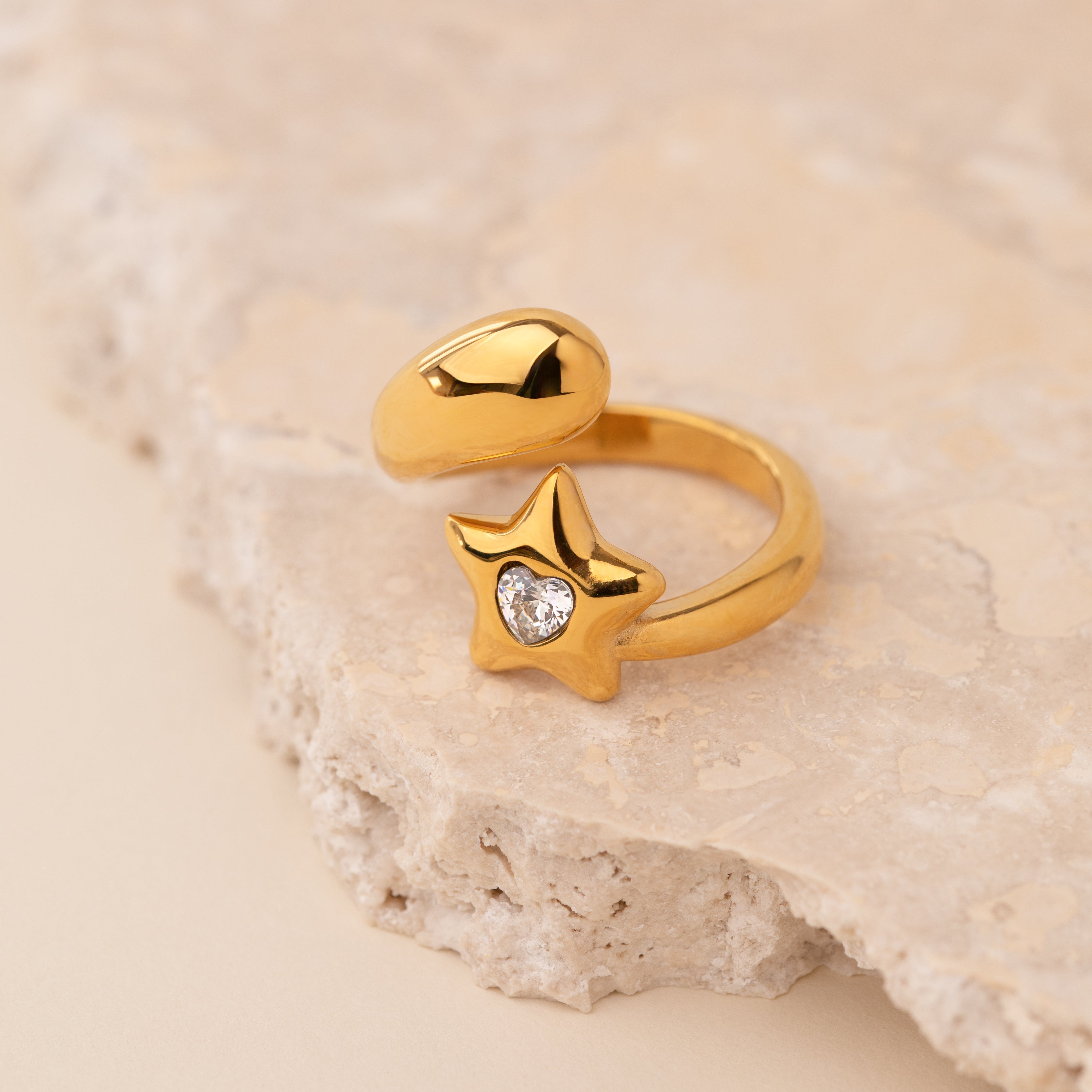 Catch a little magic with the Shooting Star Ring, a bold yet dreamy piece designed to shine wherever you go. Featuring a sculpted star with a sparkling cubic zirconia stone at its centre, this ring is available in both PVD gold-plated and polished stainless steel finishes.